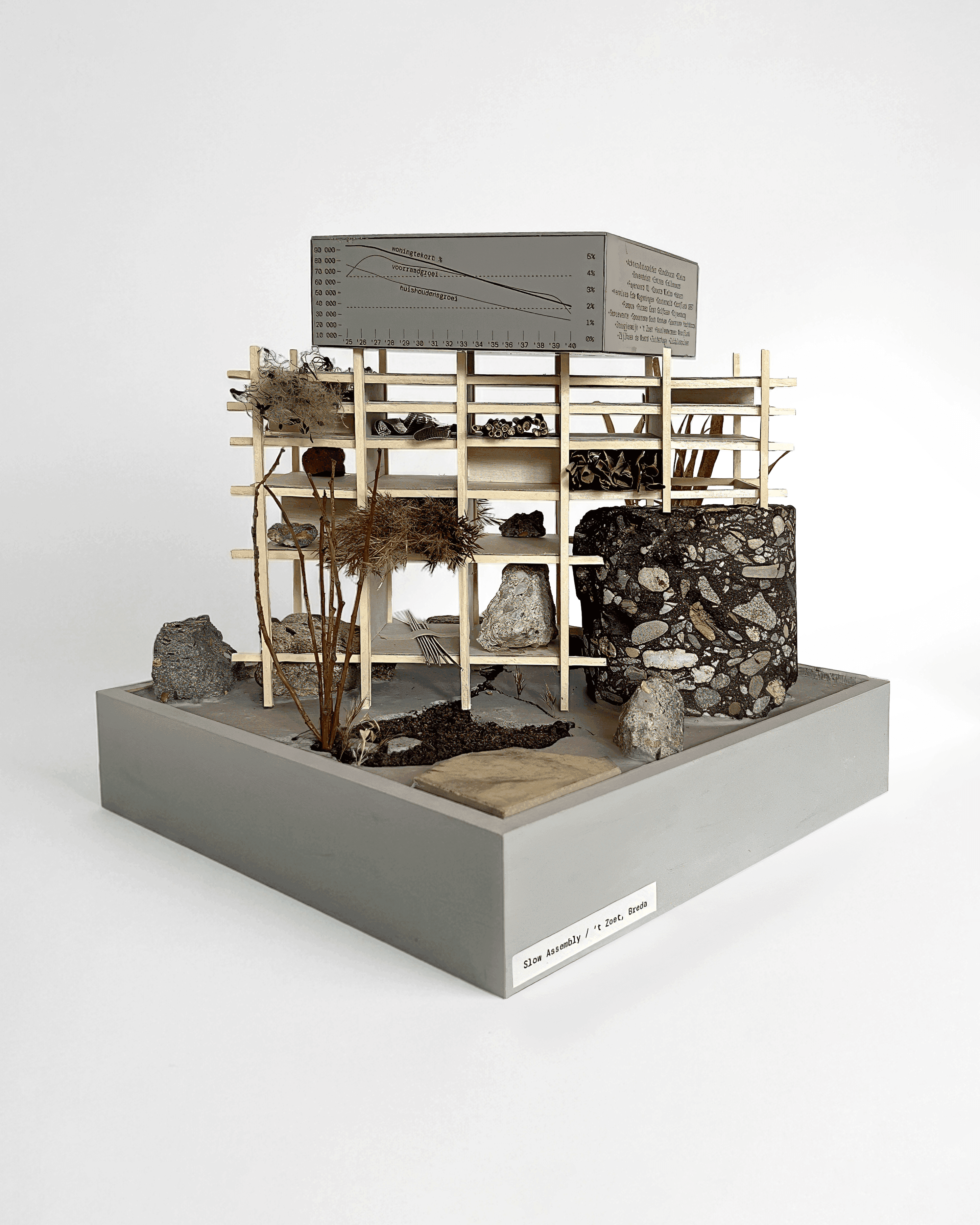 Slow Assembly daagt de tijdgebondenheid van de constructiepraktijk uit en stelt voor de ‘bioregionale tijd van materialen’ als uitgangspunt te nemen — als tegenwicht tegen de politieke versnelling van de woningbouw in Nederland. Bijzondere waardering is er voor de keuze van de locatie in Breda: het voormalige terrein van de CSM Suikerfabriek, bekend als ’t Zoet. Dit is een van de 24 Nationale Versnellingslocaties die de overheid heeft aangewezen om bij te dragen aan de bouw van 100.000 woningen per jaar. Op deze plek, waar de druk om snel te bouwen groot is, wordt het pleidooi van Słodka en Zatta concreet en invoelbaar. De jury waardeert ook het concept van ‘meervoudige temporaliteiten’: het idee dat de processen rond een constructiepraktijk niet allemaal in hetzelfde tempo verlopen. Het voorstel betoogt voor een tektonische benadering die deze uiteenlopende tempo’s productief kan verbinden.