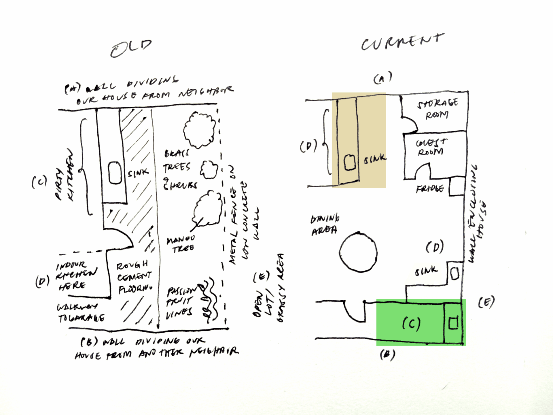 In our own house in Batangas, though not a bahay kubo, the same principle was followed by the dirty kitchen when I was young(er?). It held basins for laundry, wood scraps, old tires, bolos, and other bric-a-brac that didn’t always belong to the house’s interior. It was where grime was washed off, stray kittens were fed, and scant passion fruit harvests were stored. Only when I finished college around 2013 was it (tan, in the roughly illustrated house layout and pictured above, far left) absorbed by the rest of the then newly expanded house, only to have another small sink (green and pictured above, left) constructed outside of its new borders.