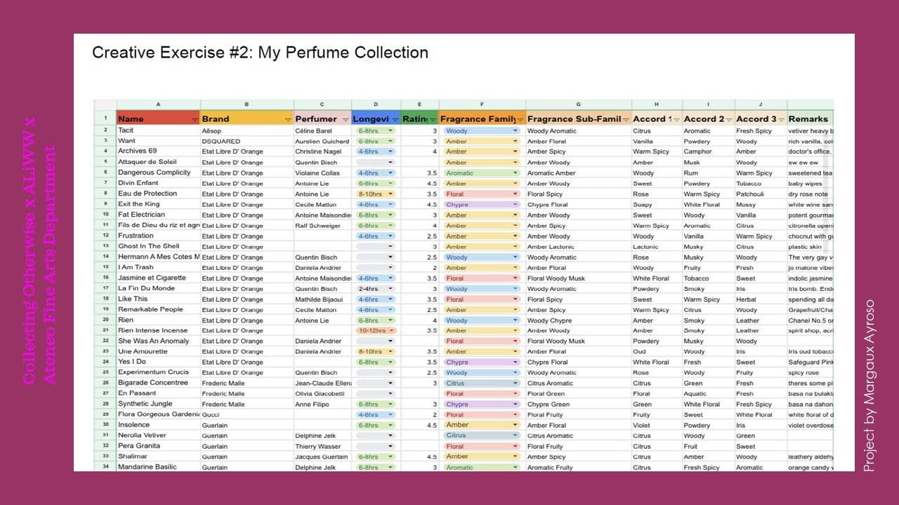 In a creative exercise that asked students to reflect on what it means to collect or archive, three responses stood out. Margaux Ayroso brought several samples of their perfume collection and let the class guess what each was before revealing their names and ingredients. Such activity helped reinforce the idea that memory is highly subjective and leads us to associating different meanings to different materials; it was also in the hands-on aspect of Margaux’s presentation that people engaged better and spoke more about how they felt or thought about the scents, whether or not they matched the actual components of the perfume. Precious Nicolas’s and Charlize Recto’s collections also emphasized this intimacy with objects, even sometimes contradicting the materials’ preservation.