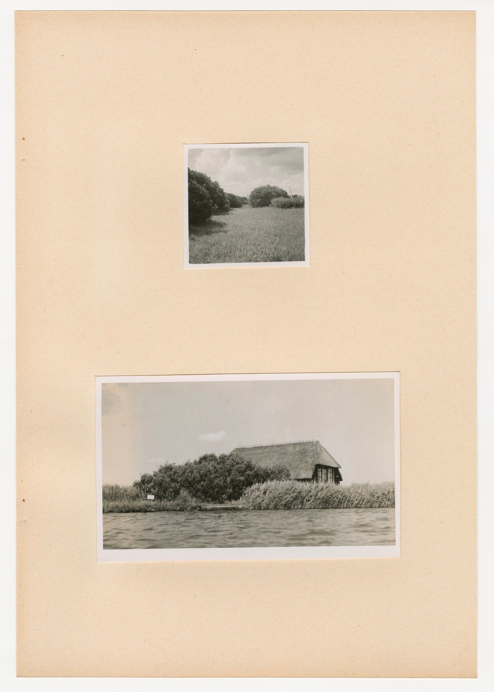 J. Vegter, photos from the report Zomerverblijven, which is part of the expansion plan for the municipality Tietjerksteradeel, ca. 1940. In order to meet the increasing demand for summer houses in Friesland, while maintaining the typical character of the Friesian wetlands, Vegter sets up guidelines for summer cottages: low ridge height, horizontal facade, surrounded by trees, using natural building materials located at some distance from each other. Archive: J.J.M. Vegter, dossier Tietjerksteradeel