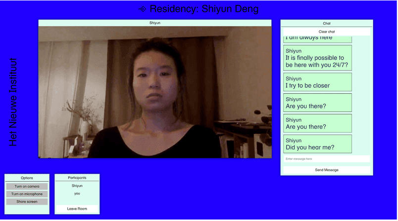 Artist Shiyun Deng was Enter's first online resident, in August 2021. Deng worked closely with one of Enter's developers, Marianne Noordzij. The work was called It Is Finally Possible to Be Here With You 24/7. Deng's project responded to the current situation of online video calling embedded in everyday life due to the Covid-19 pandemic. In her work, she asks: how does video calling change the perception of being present? What emotions does it bring about in the body?