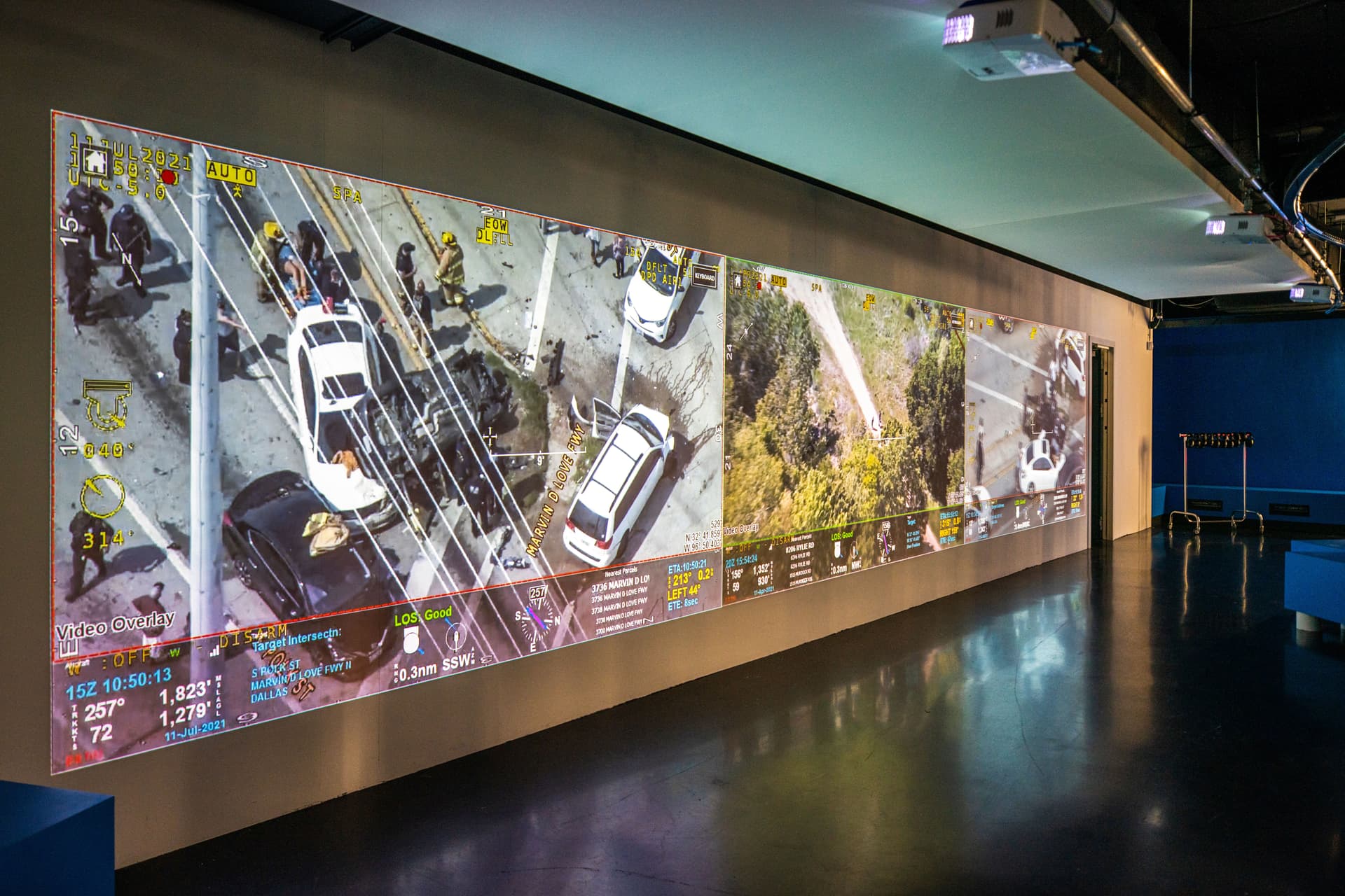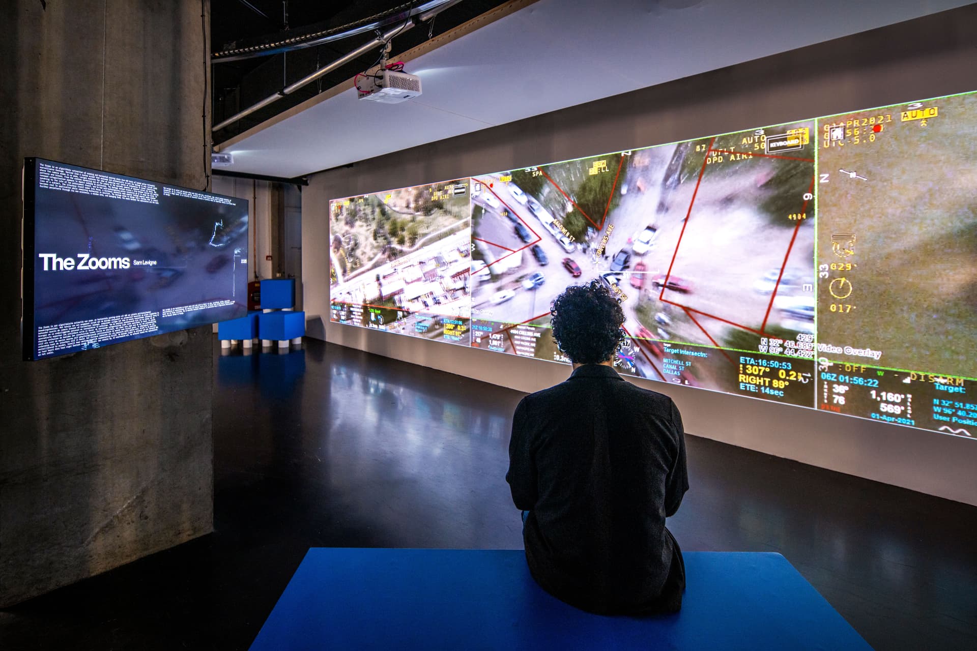 The Zooms, by Sam Lavigne, is an algorithmic extraction of zooming and horizontal panning shots from 600 hours of leaked police helicopter surveillance footage. It is on show on 2025 in -1 Digital Lab.