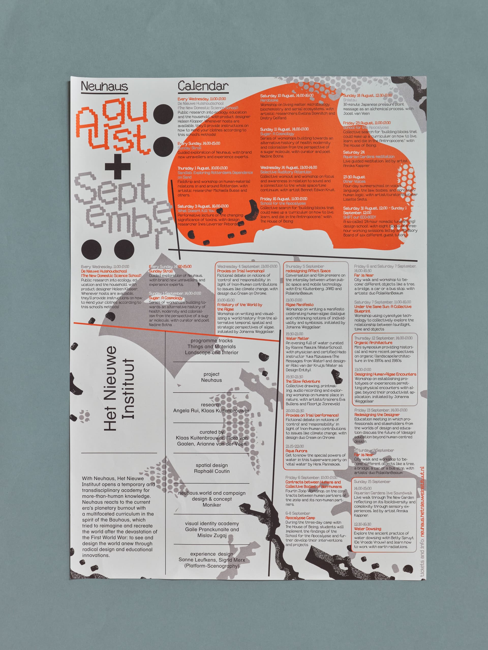 The _Neuhaus _graphic identity gradually spread over floor plans, text boards, announcements in the foyer and the main gallery's glass front. The information accompanying the exhibition is in Dutch and English. For every human language, the designers have developed a translation into non-human knowledge. This creates an illogical, chaotic graphic language, full of contradictions. A trail of signs and amorphous areas of colour runs right across the rationally ordered Dutch and English texts. "I realise that animals and plants will not understand the non-human language we have developed," says Pranckūnaitė. "Our main aim was to develop typography that evades all kinds of logical, conventional and functional typography. For us, Neuhaus has been a humbling, beautiful and ultimately failed attempt to see past our human perception. The graphic identity has many inconsistencies, cracks and illogical decisions, which is just an honest representation of the experience we all had in the Neuhaus team trying to grasp what we we've been dealing with. We're glad we didn't try to hide this confusion or present the non-human as anything that we can remotely understand. It's safe to say that we don't! But the whole Neuhaus team saw it through, and we're proud to have been part of it."
