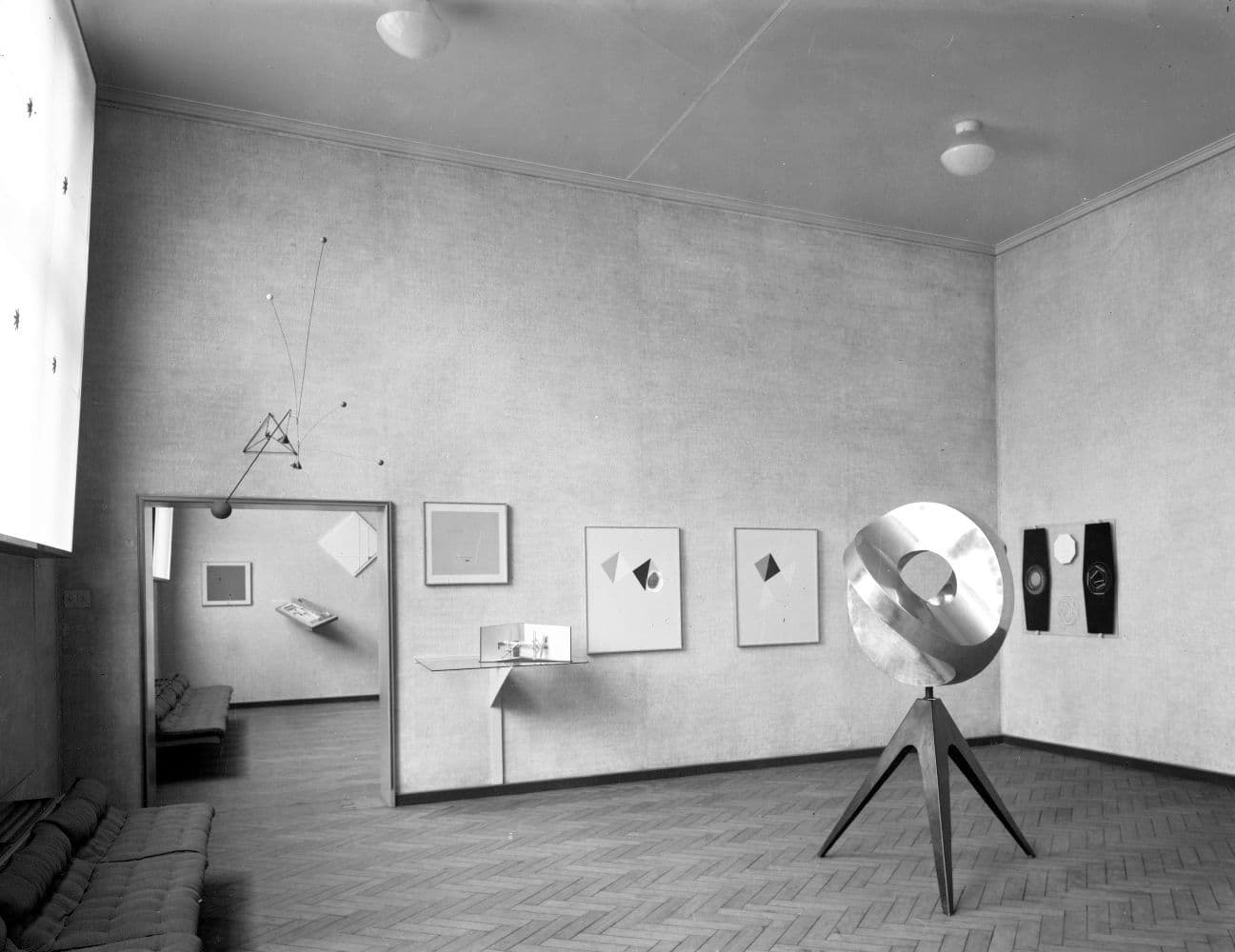 Eind 1937 zorgde directeur David Roëll voor een belangrijke koerswijziging in het Stedelijk Museum. Met Willem Sandberg als vers benoemde conservator werd het accent nadrukkelijk verlegd naar moderne kunst. Sandberg voerde als conservator in 1938 een aantal ingrijpende veranderingen door in het museum. Zo werden de wanden in de hal gewit en werd er een groot, gedecoreerd velum onder de centrale glazen kap aangebracht. In april van dat jaar richtte hij samen met architect Mart Stam de tentoonstelling _Abstracte Kunst _in. In deze tentoonstelling werd avant-gardistische kunst tegen een witte achtergrond getoond en markeert daarmee een belangrijk moment in de kunstgeschiedenis. De witte wanden en de manier waarop de kunstwerken werden gerangschikt waren zeer ongebruikelijk in die tijd. Na de oorlog werd Sandberg benoemd tot directeur en zette hij de modernisering van het museum voort. Het oorspronkelijke, historiserende museuminterieur van het Stedelijk maakte langzaam maar zeker plaats voor neutrale tentoonstellingszalen. De zogenaamde 'white cube' is sindsdien een dominante typologie in de museumwereld geworden. Hoewel er de laatste decennia regelmatig aan dat dogma wordt getornd.