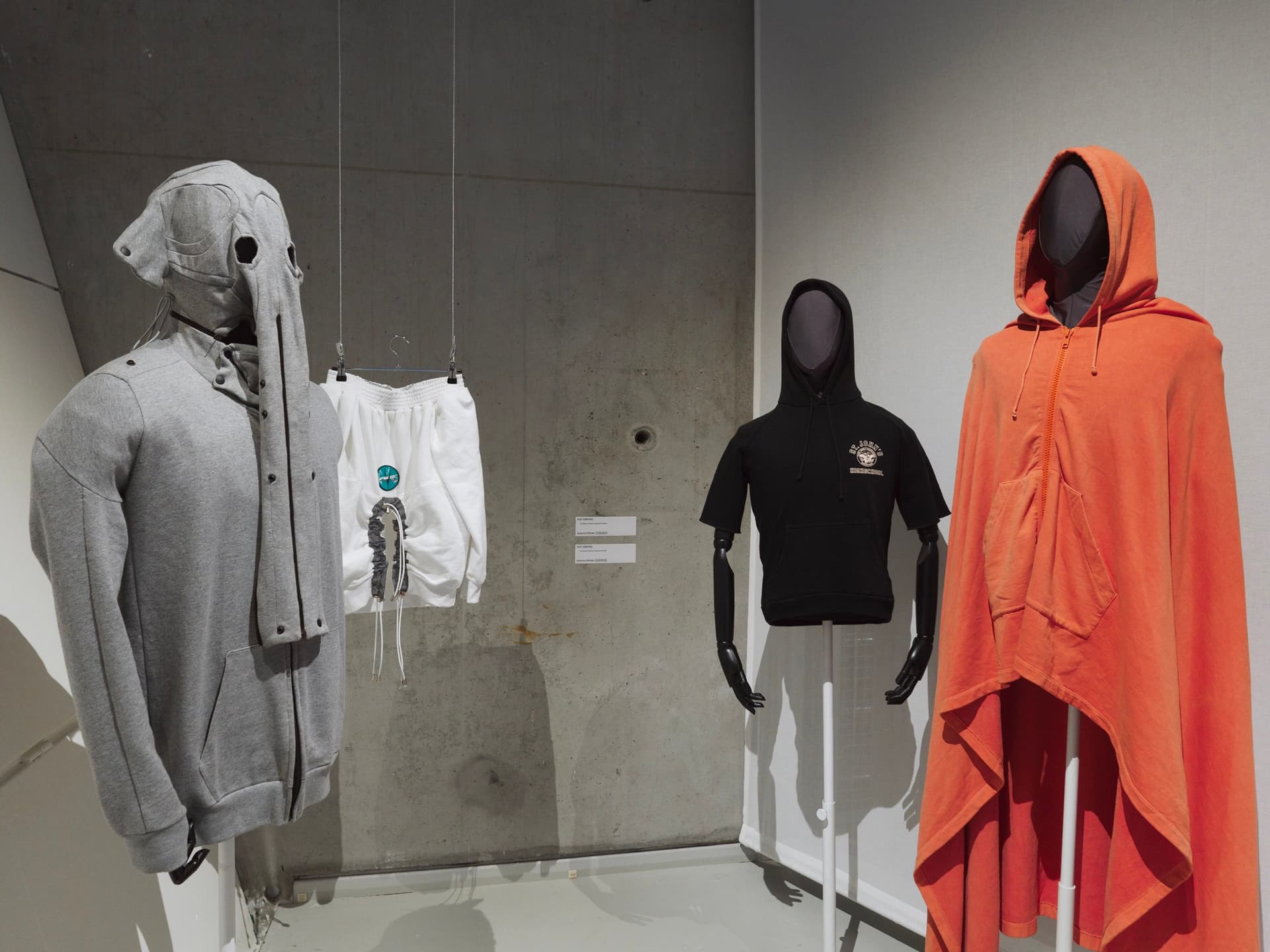Yohji Yamamoto, Sweater dress, c.1990. Collection of the Modemuseum Hasselt. Bag Carrier Cap, 1900 - 1940. Collection of the Museum Rotterdam. Cream-coloured hood, 1950-1970. Collection of the Museum Rotterdam. The Hoodie, 2019. Foto Johannes Schwartz.