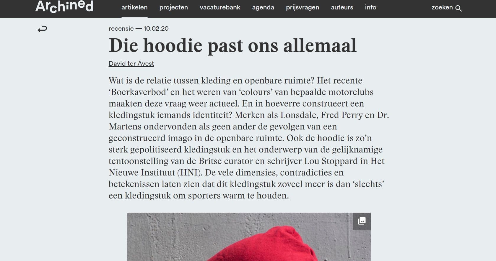 Archined "Waar is de hoodie [binnen de architectuur en ontwerpopleidingen]? Op welke wijze biedt ontwerp ruimte voor anonimiteit? Is dat nog wel mogelijk, zelfs of juist niet als je een hoodie draagt? In hoeverre ontwerpen we eigenlijk voor elk publiek, of is de hoodie puur een sociaal construct?"