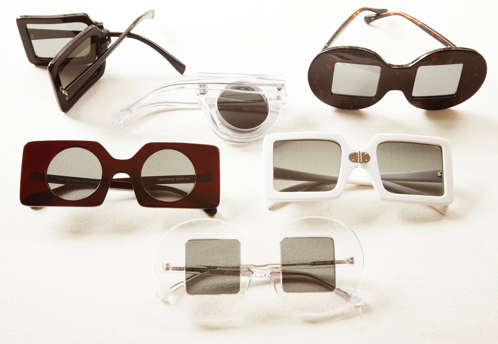 For sunglasses, I thought about what the basic shapes are. The sunglasses reduced and purified in design to the elementary characteristics of eyewear: lens shape, frame shapes and fixtures. Six styles include: circle frame, basic square frame, circle frame with square lens, square frame with circle lens, and circle and square frames connected with a hinge in the middle. Available in red, black, white, clear, grey and tortoise.