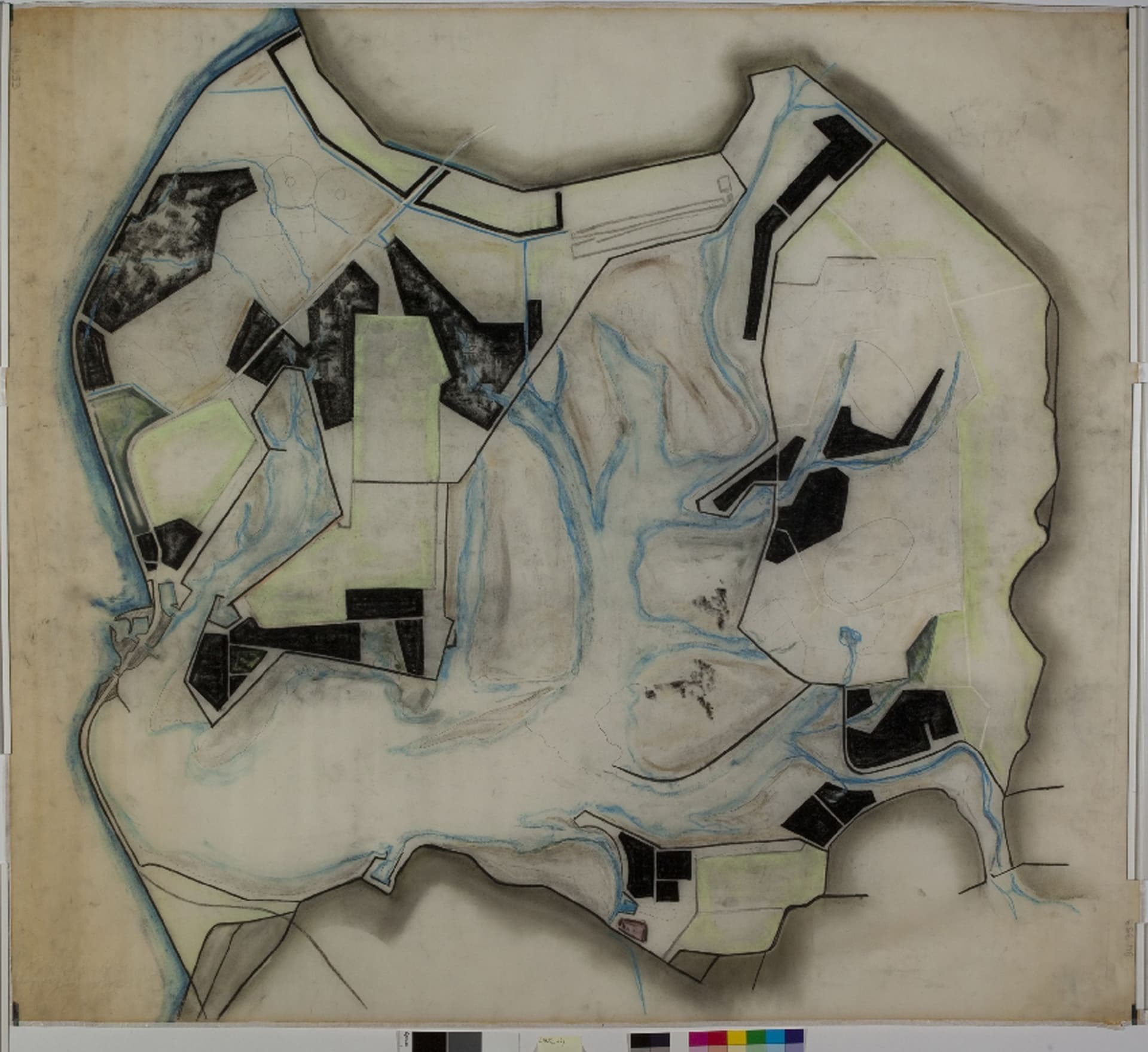 Alle Hosper, Biesbosch, 1966-1967. In dit ontwerp voor zoetwaterbekkens in de Biesbosch ten behoeve van drinkwatervoorziening in West Nederland zoekt Hosper een contrast tussen de gestileerde ovaalvormen en eivormen (nodig voor optimale waterberging) en het ruige natuurlandschap, met geulen en kreken.