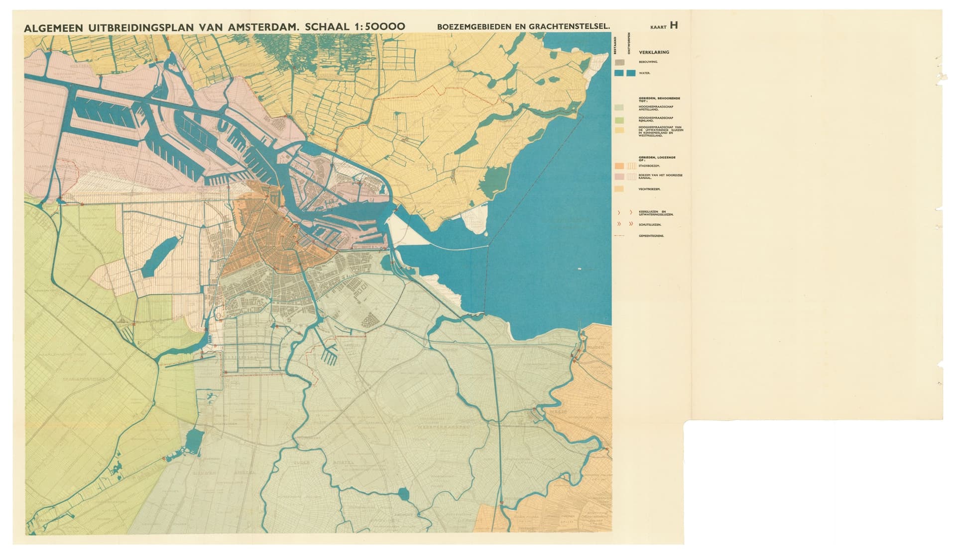 C. van Eesteren, Algemeen Uitbreidingsplan, Amsterdam, 1935. Dit plan voor het hele uitbreidingsgebied van Amsterdam is gebaseerd op een samenhangend stelsel van verkeers- en waterwegen en groengebieden. Groengebieden in de stad lopen door tot in het omliggende land. Ontspanning en recreatie zijn één van de pijlers van het AUP.