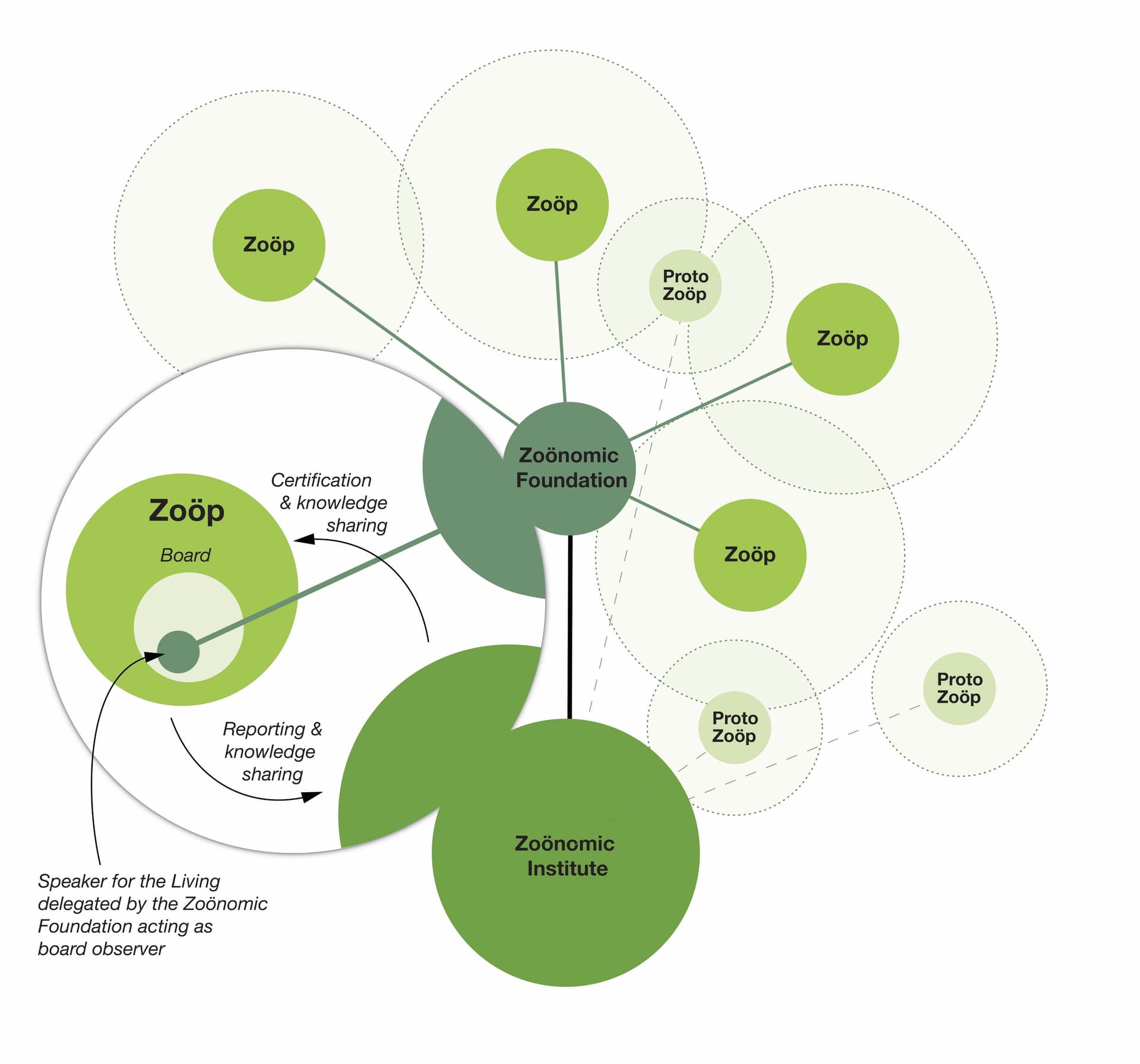 Het Zoöp model bestaat uit drie delen, elk met hun eigen rollen en verantwoordelijkheden. Het Zoönomisch Instituut, de Zoönomische Stichting en de Zoöps zelf. Samen vormen deze instanties een beweging en een netwerk van kennis en uitwisseling, waarbij Zoöps gevoed en ondersteund worden in al hun inspanningen.